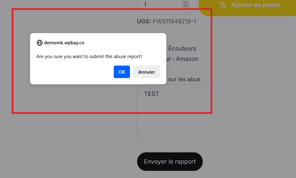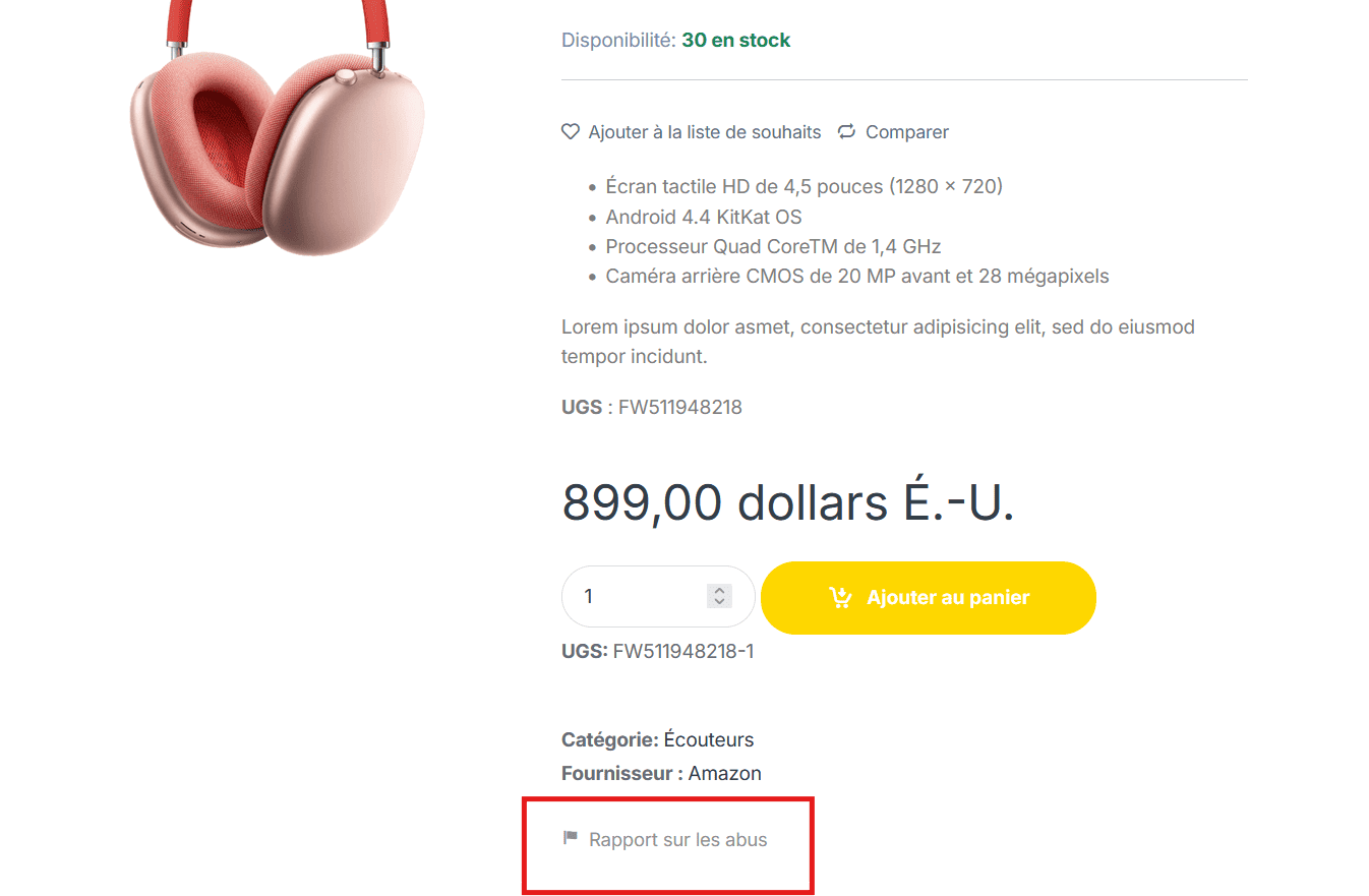 - Repérez le petit bouton « Signaler un abus » situé sous chaque produit.